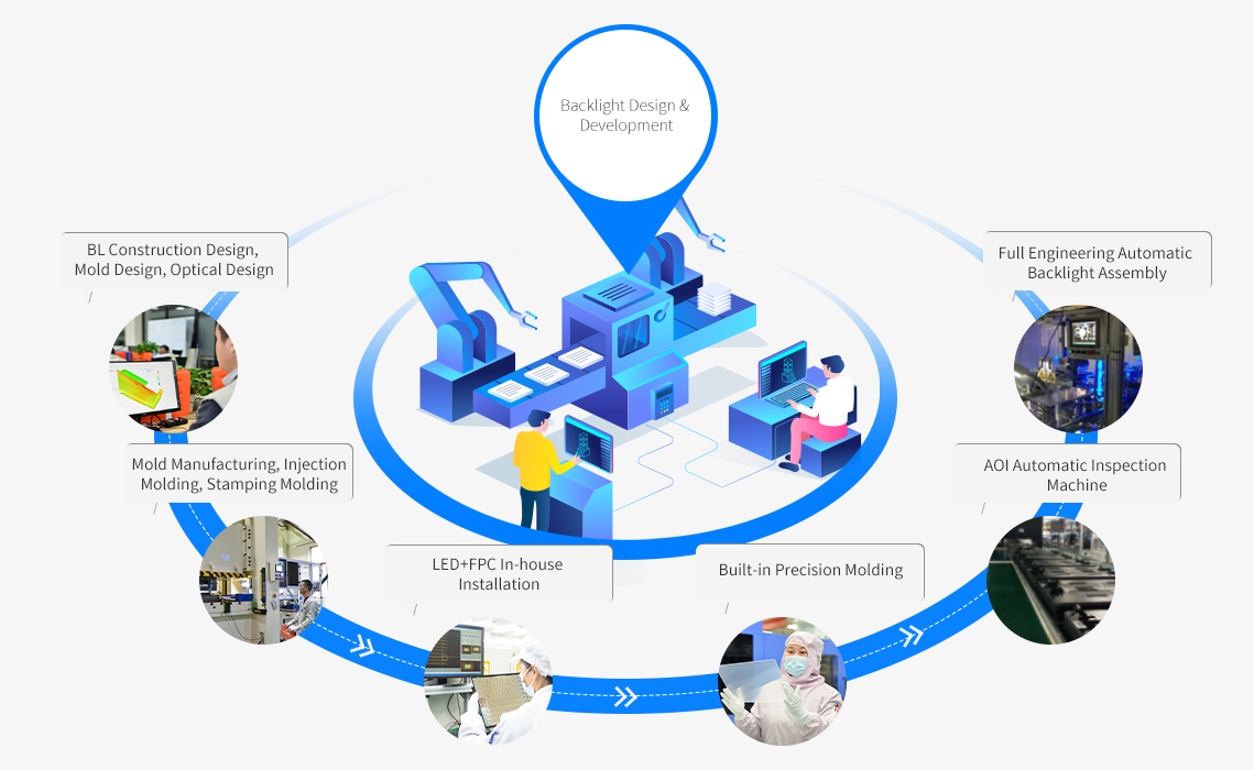 The company devotes itself to the backlight display module field. by continuously making technological innovation and strengthening integrated production capacity, it continuously creates high-quality products with leading technology, excellent quality and comprehensive services. With many years of mold design and manufacturing experience and adopting Japan high-precision mold processing equipment, the company keeps pave with customer needs, and values product portfolio development, so as to provide customers with one-stop professional products and technical solutions.